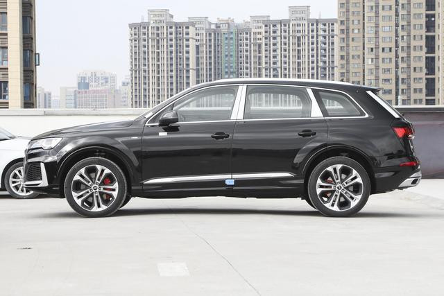 奥迪Q7定位是一台中大型SUV,实际的车身尺寸也很大,长度达到了5077mm,但是从车身侧面看并没有展现出中大型SUV的气场,不过豪华感营造的很到位,车窗边框以及车顶行李架都用镀铬材料进行装饰,为车身侧面提升豪华感的同时增加了层次感,前后轮眉整体向外突出,为整车增加了力量感,同时,奥迪Q7还标配了空气悬挂,支持高低调节,在越野的时候能够提升通过性。